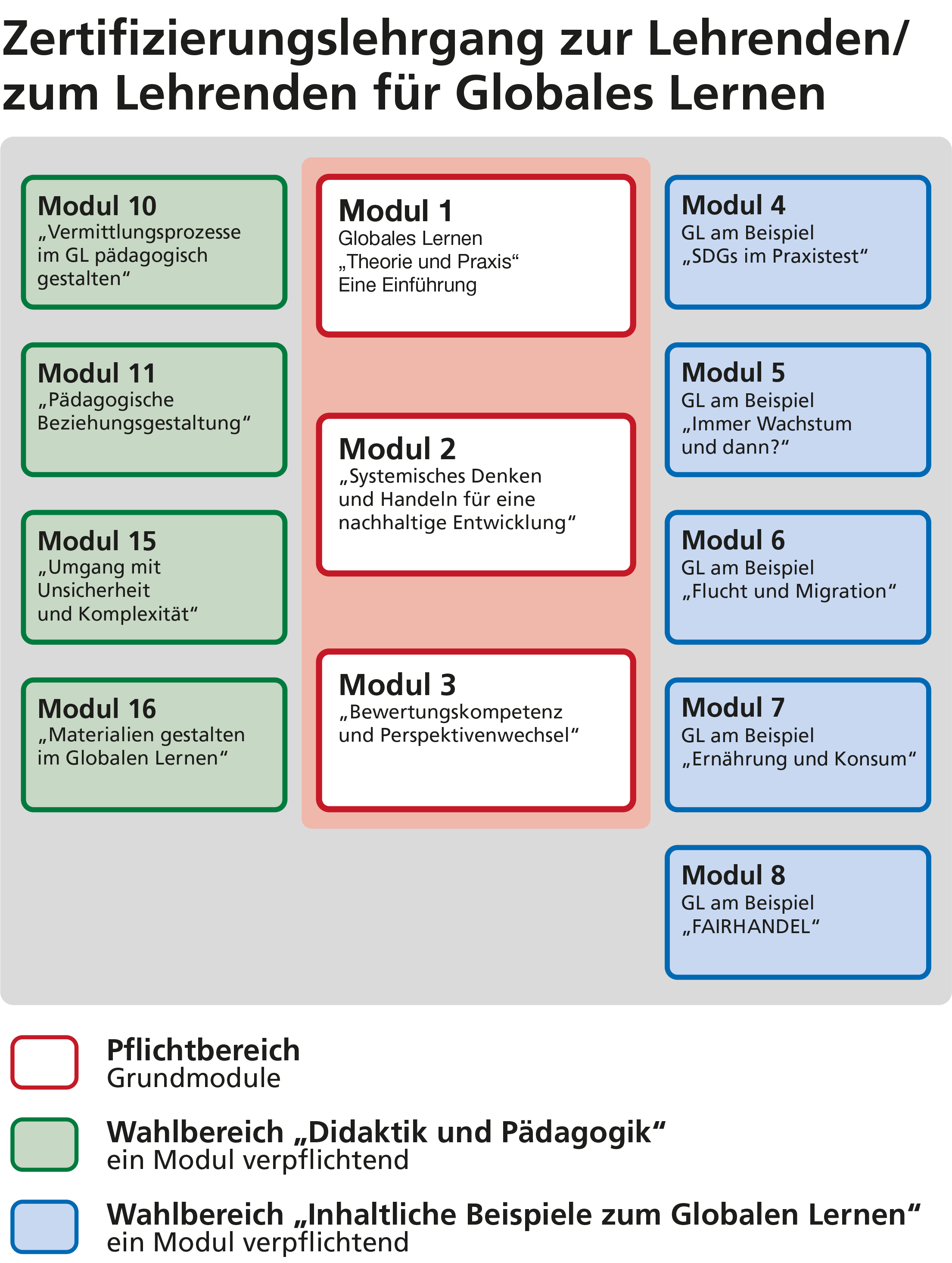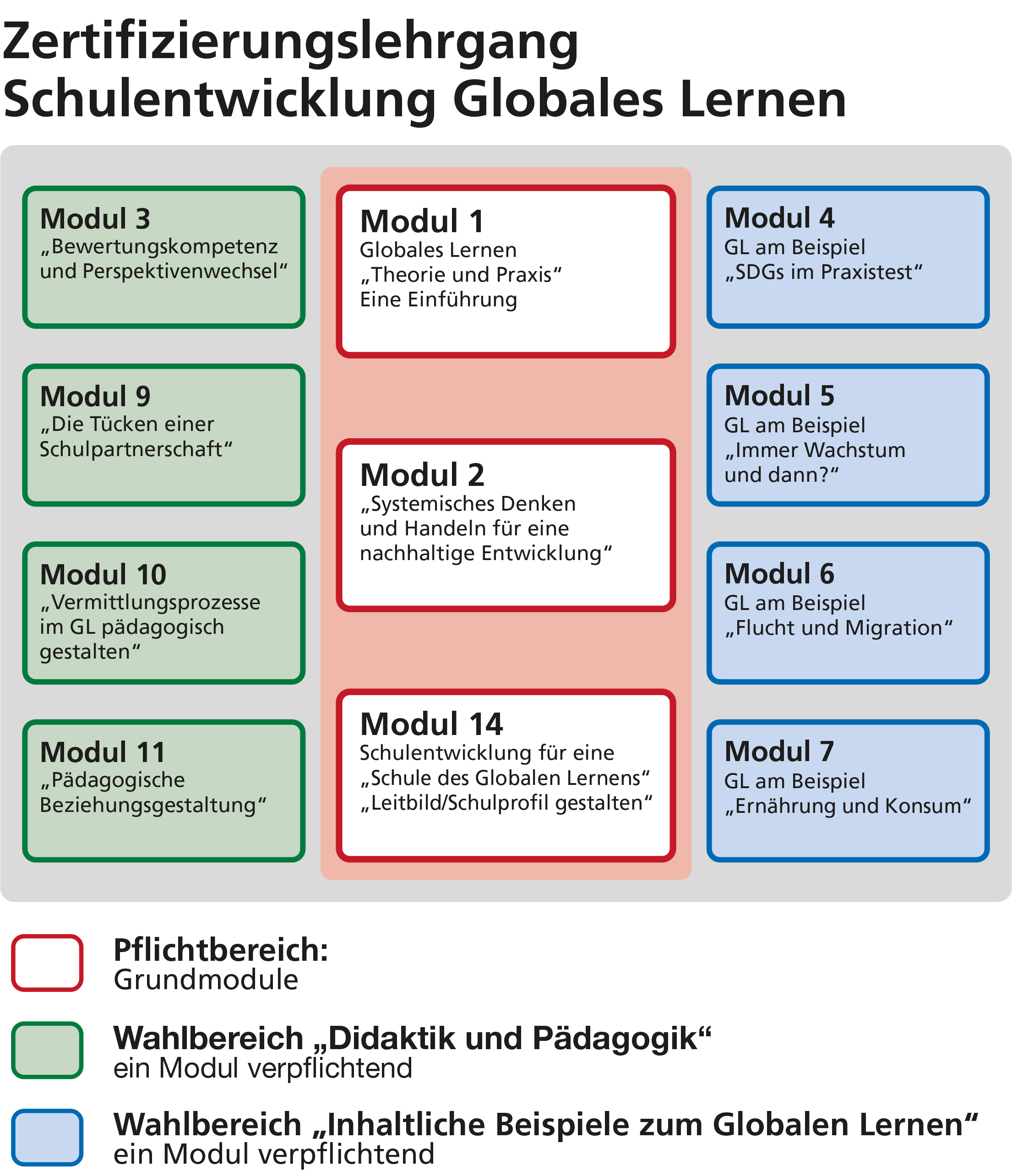 Auch für dieses Zertifikat dienen die Module zur theoriebasierten und praxisorientierten Einführung in Konzepte Globalen Lernens zunächst als Grundlage. Der Schwerpunkt liegt dann jedoch darauf, wie Schul- und Leitbilder im Sinne Globalen Lernens bzw. einer nachhaltigen Entwicklung umgesetzt werden können.